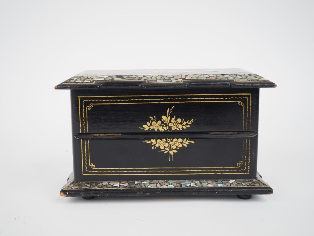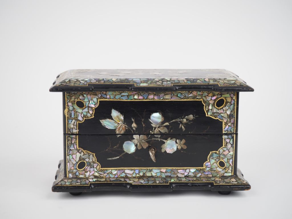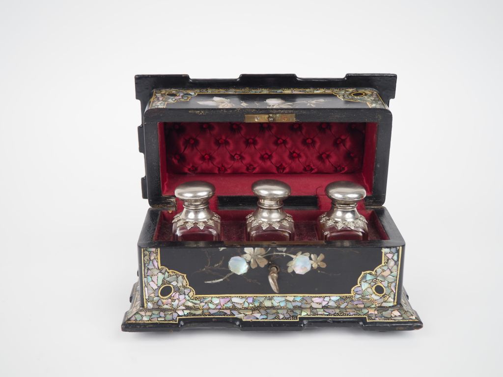 Cave à odeurs Napoléon III en marqueterie de burgot et bois noirci, intérieur à trois flacons en cristal et métal argenté. Avec sa clé Dim. 13 x 20,5 x 10,5 cm