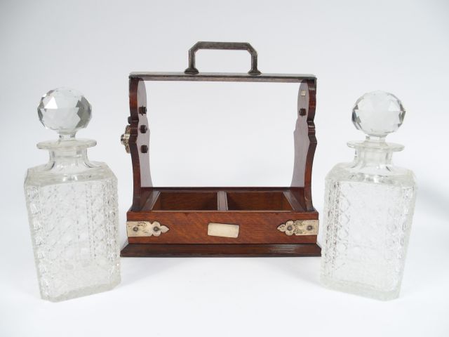 Cave à whisky anglaise en chêne, cristal et métal argenté comprenant une paire de flacons à décor de croisillons.