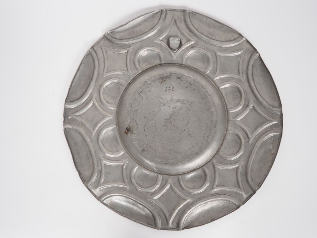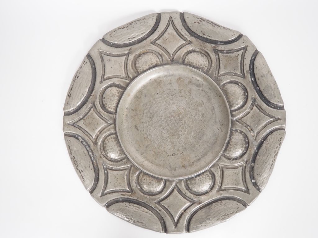 CHANAL. Plat Art Déco en étain, à décor de motifs géométriques. Signé Diam. 39 cm