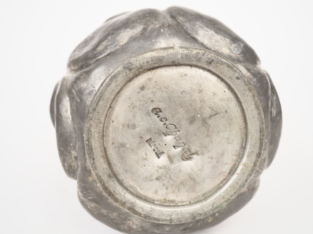 Lot de CHANAL. Vase tronconique en étain à décor de volutes. Signé. H. 30 cm. au prix de 30 à 50 € en vente aux enchères par l'hôtel des ventes Primardeco