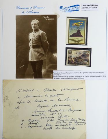 Charles NUNGESSER - photo signée Nungesser dédicacée au capitaine Silvestre Avril 17 + 1 vignette - 1 carte postale 'Nos as' Nungesser + 2 vignettes - 1 photo avec notes de Nieuport …