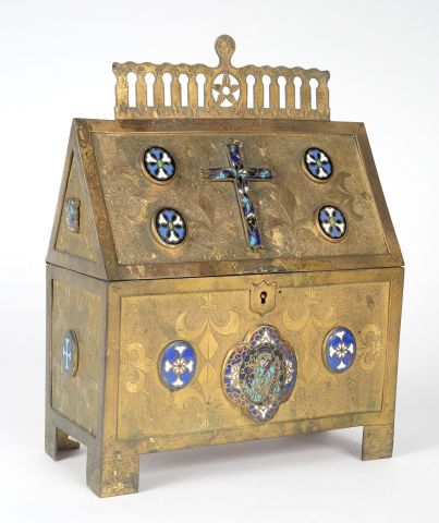 Châsse de style Haute Epoque, en métal doré et émaux cloisonnés. 23 x 17 x 8,5 cm