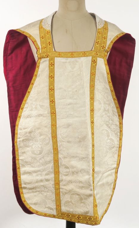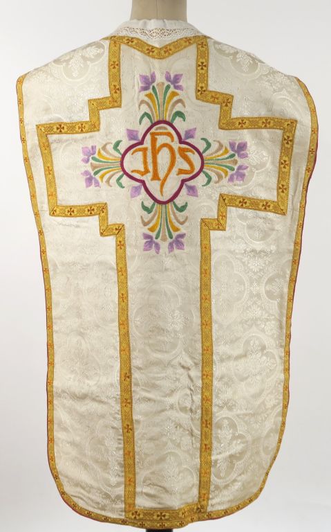 Chasuble début Xxème, fond satin façonné crème, à décor polylobé, orfroi du dos brodé en soie polychrome d’un monogramme au nom de Jésus "IHS", entouré d’un décor floral. Doublure coton rouge. Bel état de fraicheur. Expert : Véronique Dumont Castagné