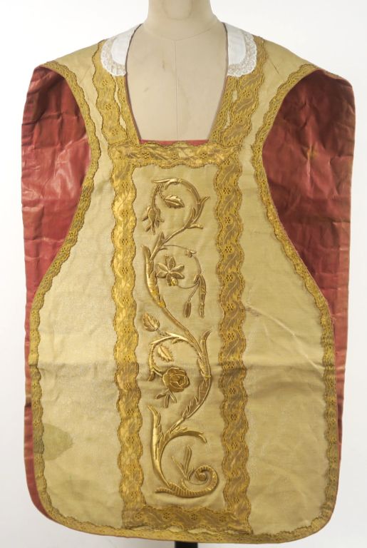 Chasuble fin XIXème - début Xxème. Fond drap d’or. Orfroi avant aux arabesques florales brodées en guipure filé or, décor identique sur l’orfroi du dos dans lequel s’inscrit dans la partie centrale un Agneau de Dieu aux pattes et tête argentées et au corps brodé en bouillon argenté, doublure bougran rose. Bel état. (tache à l’avant) Expert : Véronique Dumont Castagné