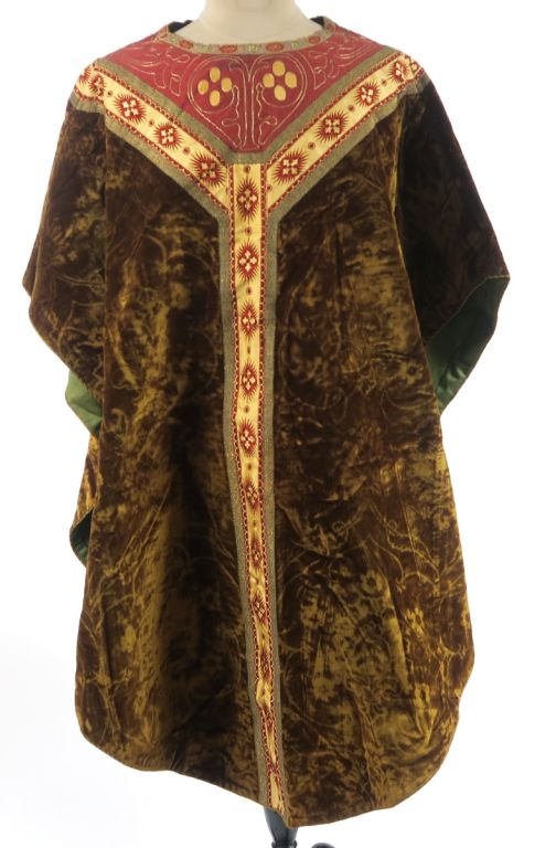 Chasuble semi-gothique et son étole XIXème - XXème , velours vert frappé, décor en ferronnerie et aux chardons dans le goût de la Renaissance, galons façonnés et broderies aux fils d’or à l’encolure. Bel état d’usage. Expert : Véronique Dumont Castagné