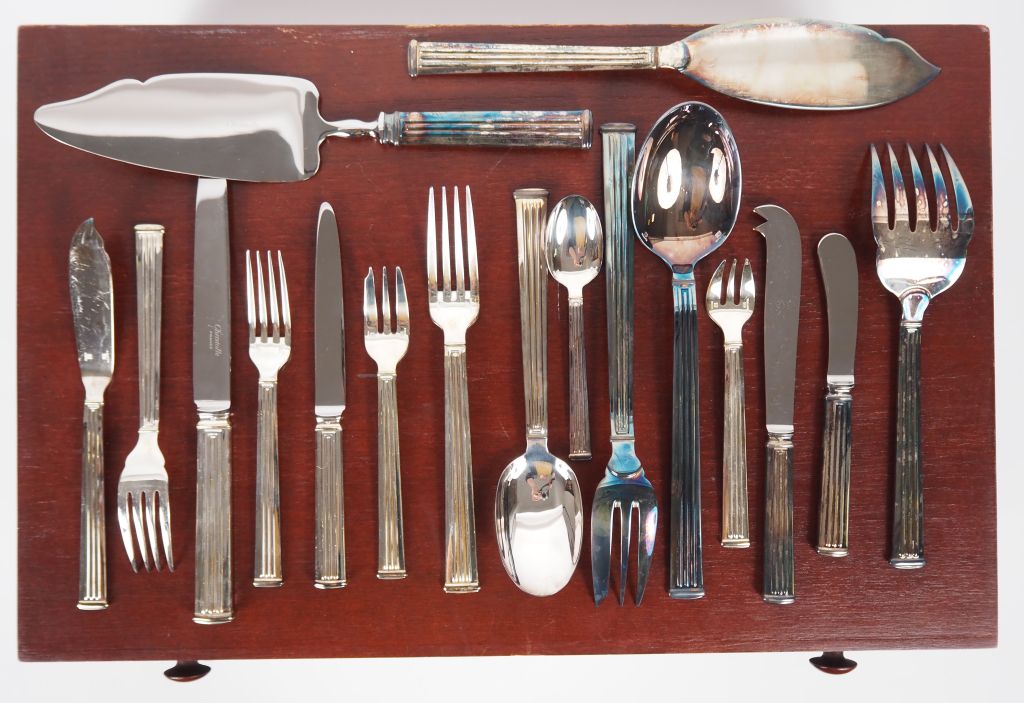 CHRISTOFLE. Ménagère de style Art déco en métal argenté, complète, dans son coffret à trois tiroirs. (Etat neuf) comprenant : 12 grands couverts 12 grands et 12 petits couteaux 12 fourchettes à entremets 12 fourchettes à dessert 12 petites cuillères une louche un couvert à servir une pelle à gateaux un couvert à servir le poisson un couteau à beurre un couteau à fromage 2 pinces à sucre 12 fourchettes à gateaux 12 fourchettes et 12 couteaux à poisson