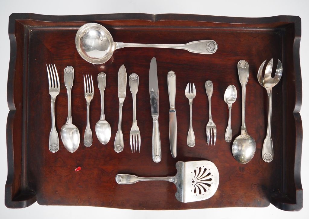 CHRISTOFLE. Ménagère en métal argenté, modèle à double coquille et filets comprenant : 12 grands couverts + 12 grandes fourchettes 12 couverts à poisson 12 couverts à entremets + 12 fourchettes à entremets 24 grands et 24 petits couteaux 12 fourchettes à huitres 12 fourchettes à gateaux 12 petites cuillères 4 pièces de service (manque une pièce de service) Dans un meuble adapté de style Louis XV, en acajou ouvrant à cinq tiroirs
