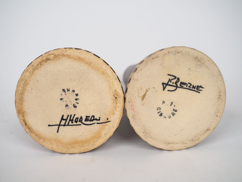 CIBOURE. Deux soliflores en céramique, à décor de paysans. Signés Berne et Hareau. H. 14,5 cm