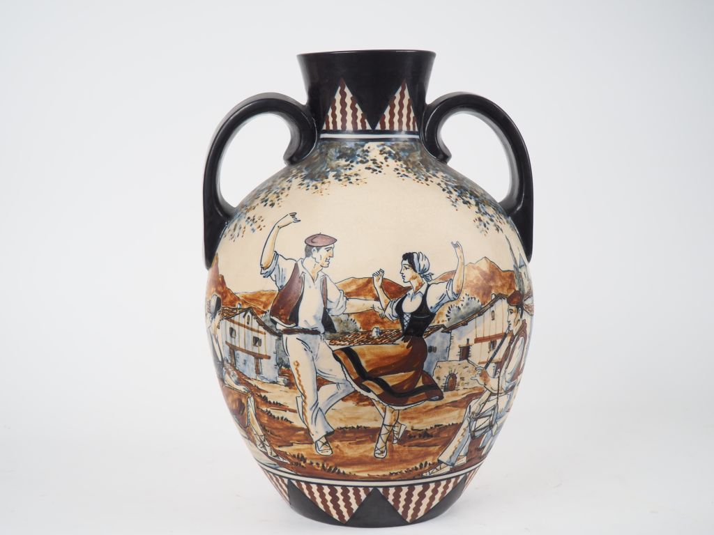 CIBOURE. Vase ovoide à anses en céramique à décor de pelotari et de fandango. Signé Riberne RF CIBOURE. H. 38 cm