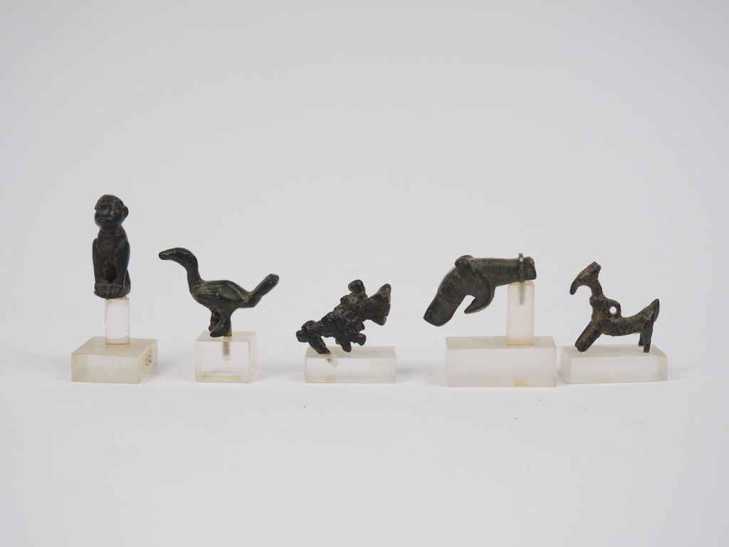 Cinq petits bronzes zoomorphes antiques dont un pendentif du Luristan VIII-VIIe s. av. J.-C. H. : 3.2 cm, 3 cm, 4 cm, 4 cm, 3.2 cm.
