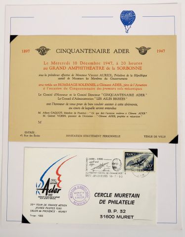 Clément ADER : Ensemble consacré à Clément Ader comprenant : - 'Les vérités sur l'utilisation de l'aviation militaire' C. ader. Ed. les frères Douladoure Toulouse 1919, 214 pages dédicacé par l'auteur - 'l'aviation militaire' C. Ader, Ed, Berger Levrault, 1914, 350 pages - 'Avionnerie militaire'. C. Ader. Ed. Berger Levrault, 1912, 104 pages - 'Clément Ader, sa vie son œuvre'. G. de Manthé. Ed. Privat Didier, 1936, 367 pages, dédicacé par l'auteur 3 feuilles comprenant : un livret : Cinquantenaire Ader 1947, 2 enveloppes commémoratives 1947, Invitation au cinquantenaire Ader à la Sorbonne, Paris + enveloppe centenaire 1er vol d'Ader (1890/1990)