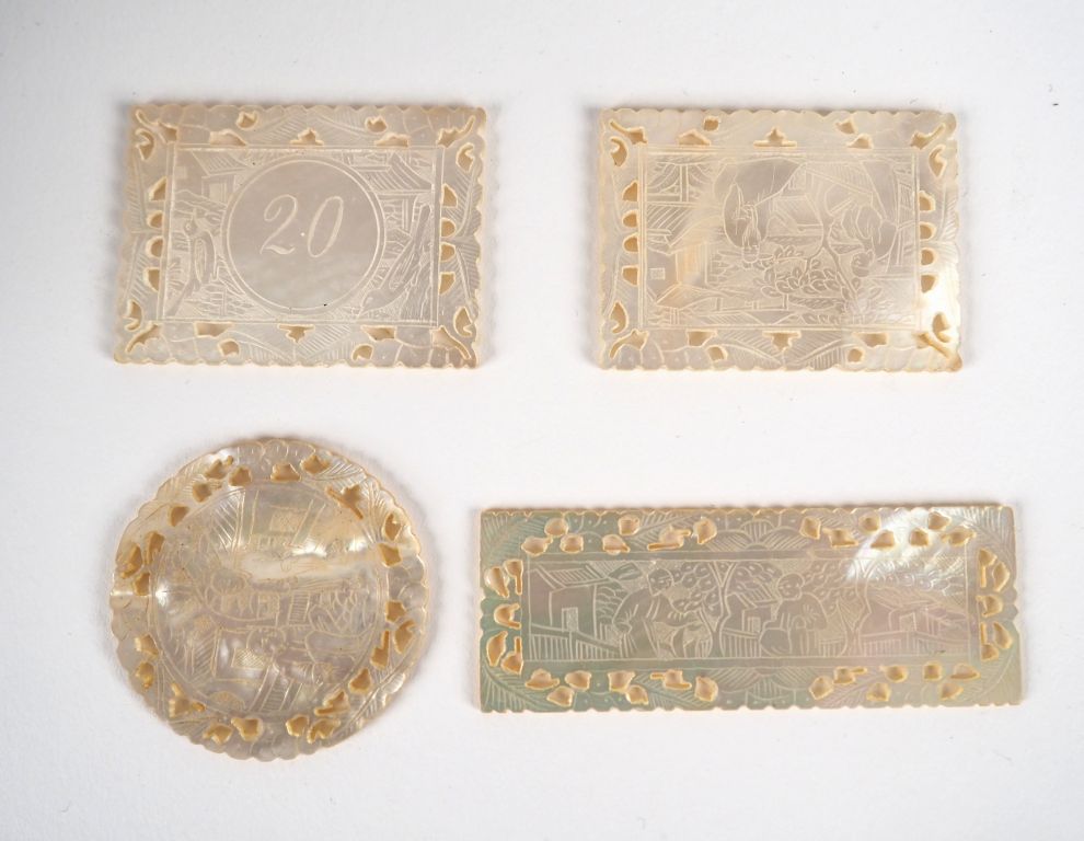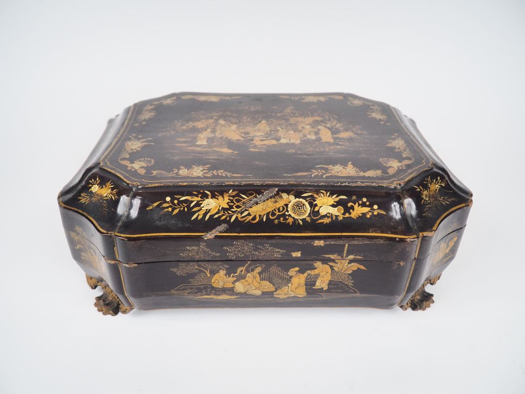 Coffret à jeux Napoléon III de style Extrême-orient en bois laqué à décor de personnages dorés sur fond noir. Intérieur à compartiments avec ses jetons en nacre. Dim. 13 x 31 x 38 cm. (chocs).