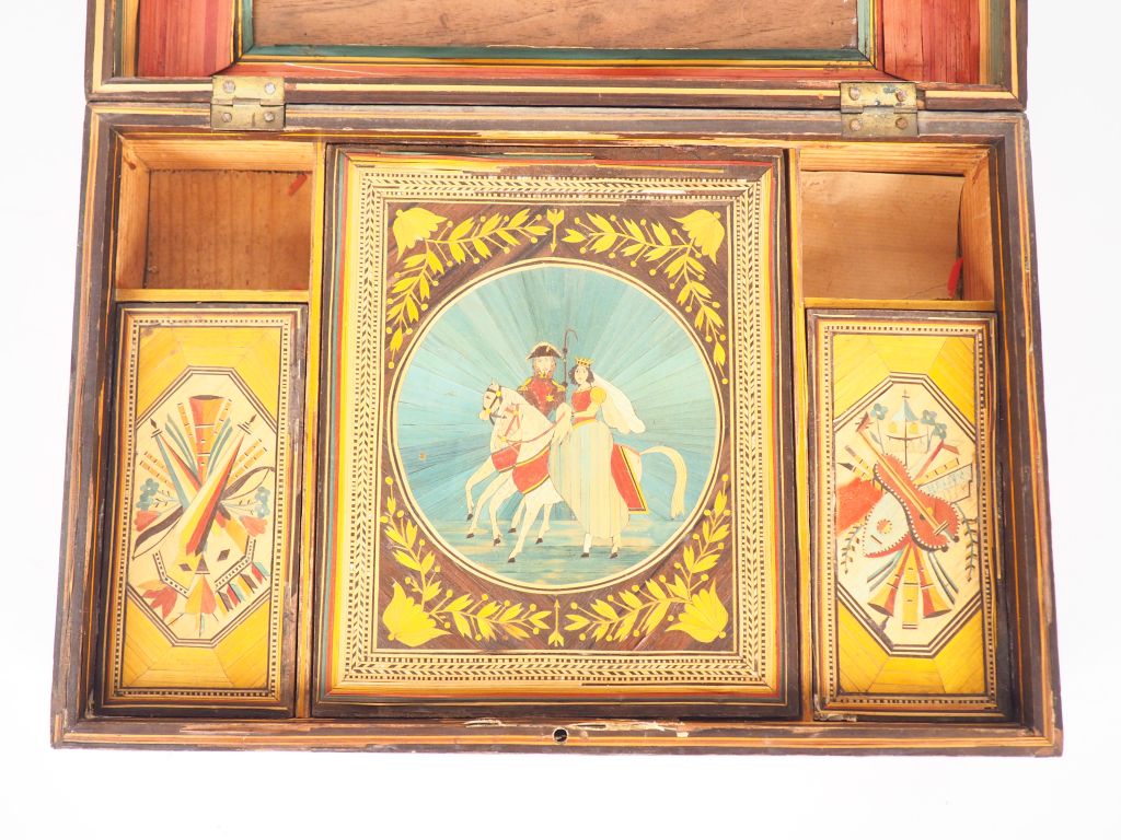 Coffret à ouvrage XIXème en marqueterie de paille à décor d'une vasque de fleurs et de rinceaux feuillagés, bel interieur à décor de trophées et de cavaliers. Dim. 10,5 x 33,2 x 22 cm.