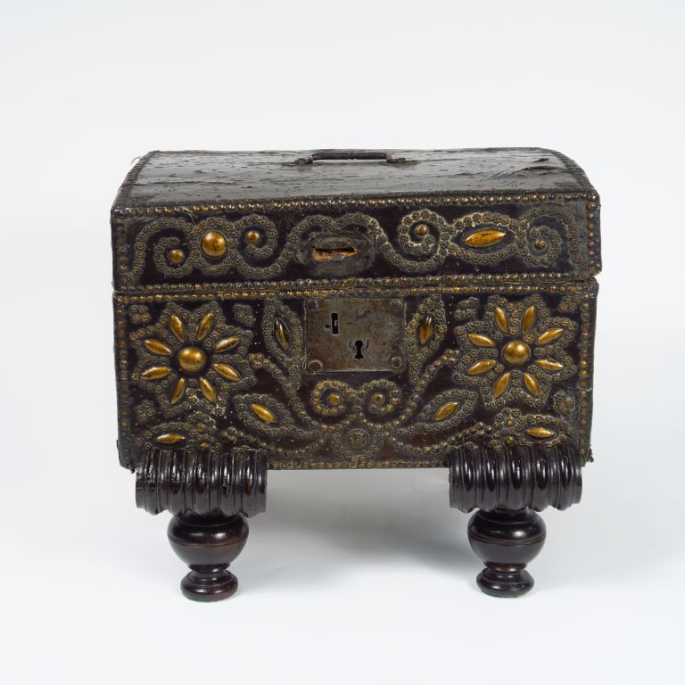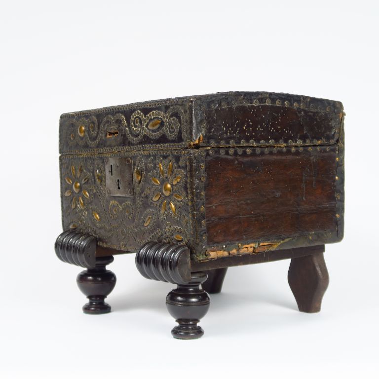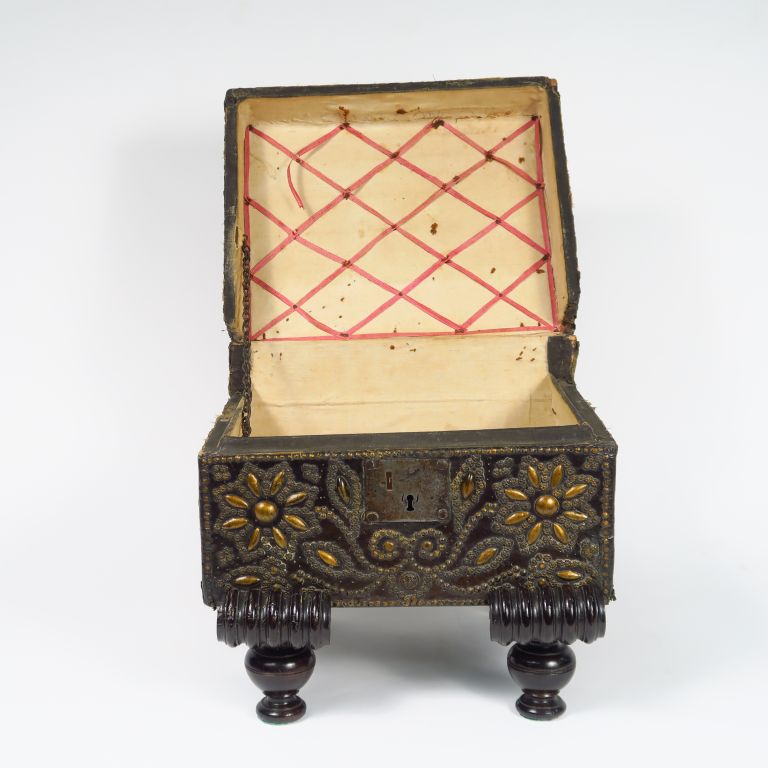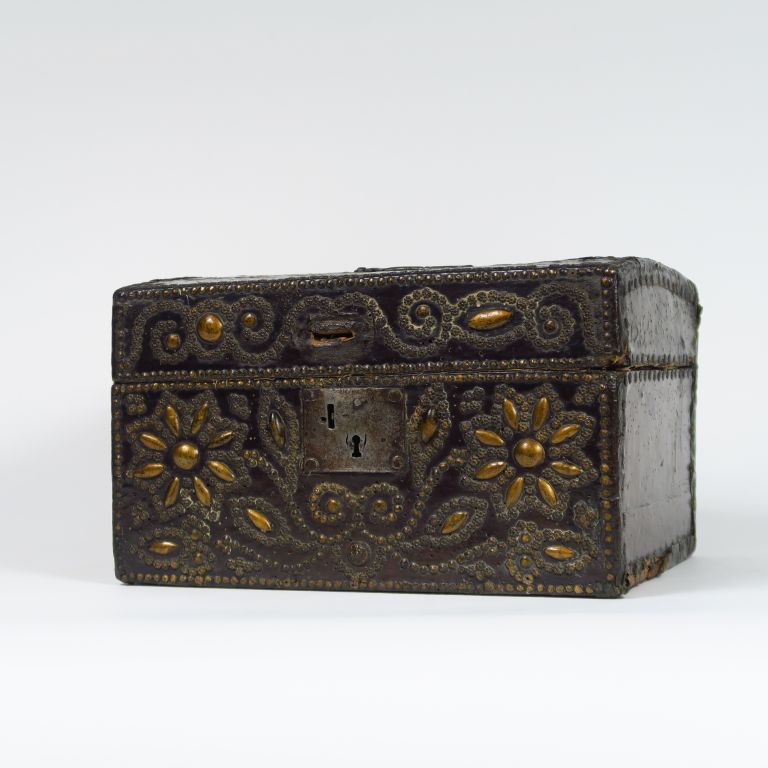 Coffret de voyage Louis XIV en cuir clouté et laiton, présentoir en bois sculpté à décor de fleurs. Dim. : 20 x 27 x 34 cm. (accidents)