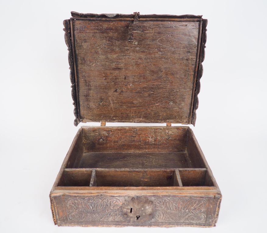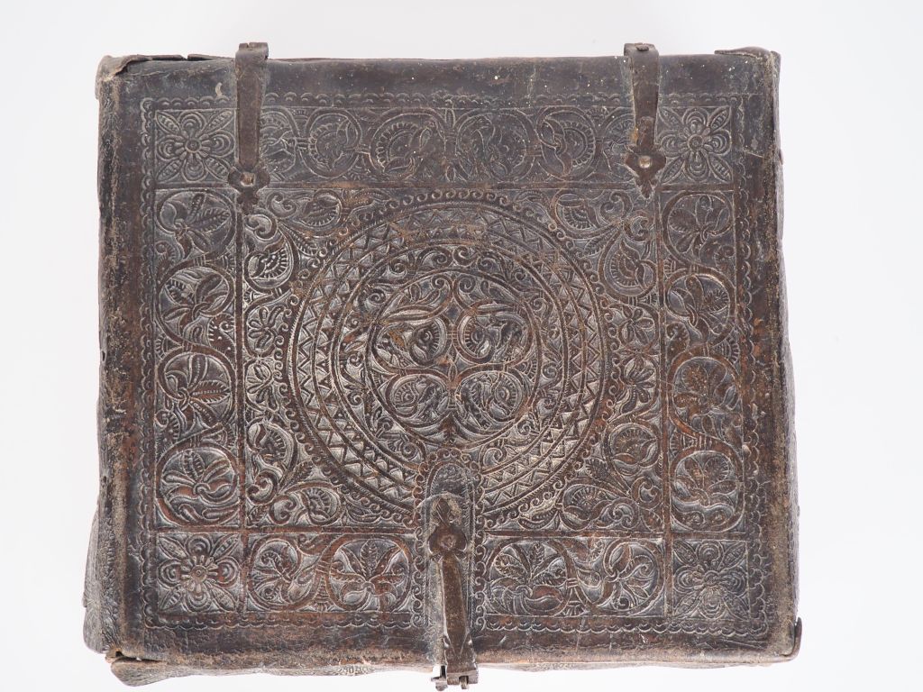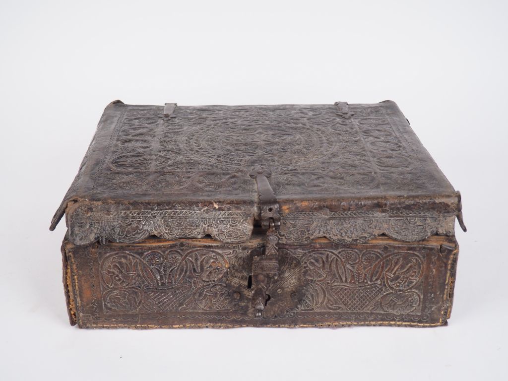 Coffret de voyage Louis XIV en cuir sur âme de bois, à décor gauffré de rinceaux et de motifs géométriques, charnières et serrure en fer forgé. Dim. 14,5 x 40 x 37 cm. (Usures).