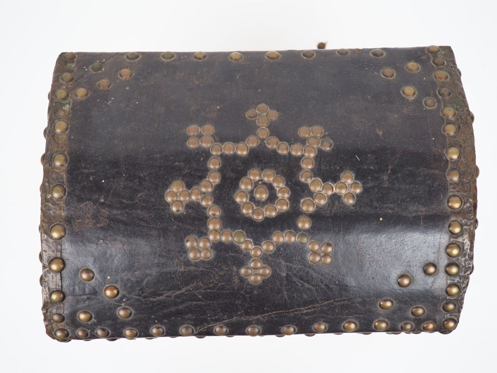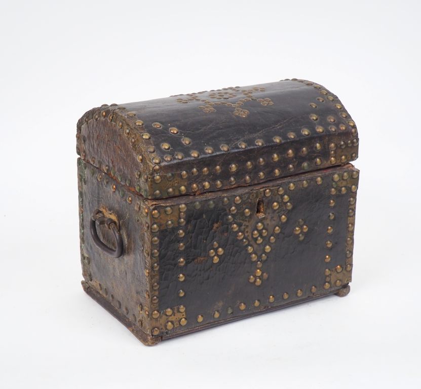 Coffret Louis XIV en bois gainé de cuir clouté. (usures) Dim. 28 x 30 x 23 cm