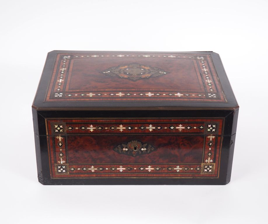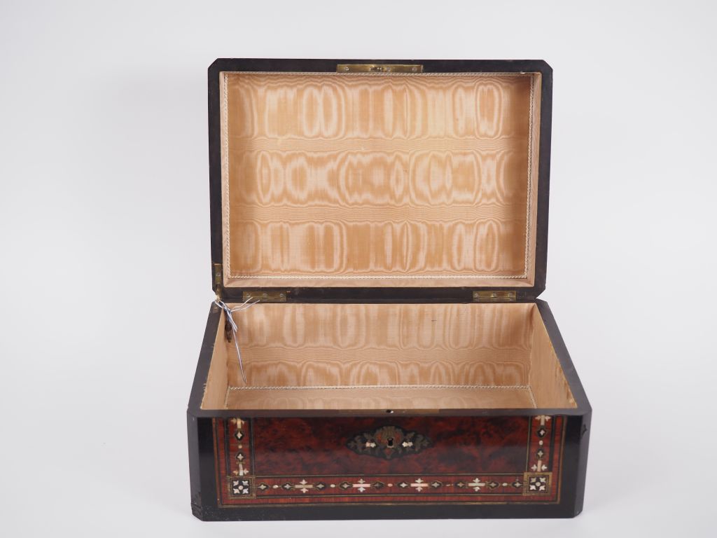 Coffret Napoléon III en marqueterie Boulle. Dim. 16 x 34,5 x 24,5 cm (petits accidents)