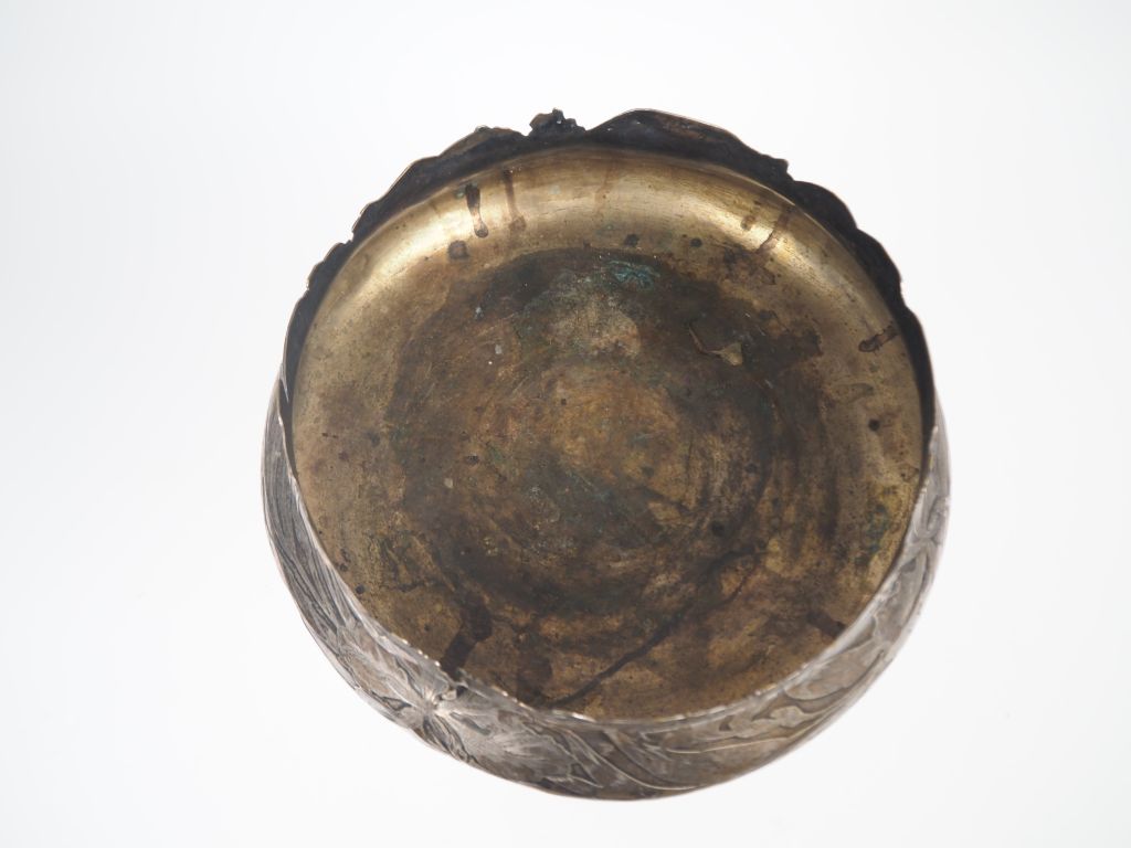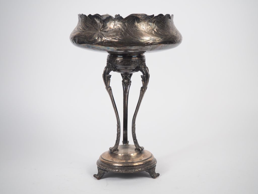 Coupe Art Nouveau en métal argenté à décor de fleurs et de feuillages en léger relief, piètement tripode réuni sur une base circulaire. (base et coupe séparées) H. 41 cm.