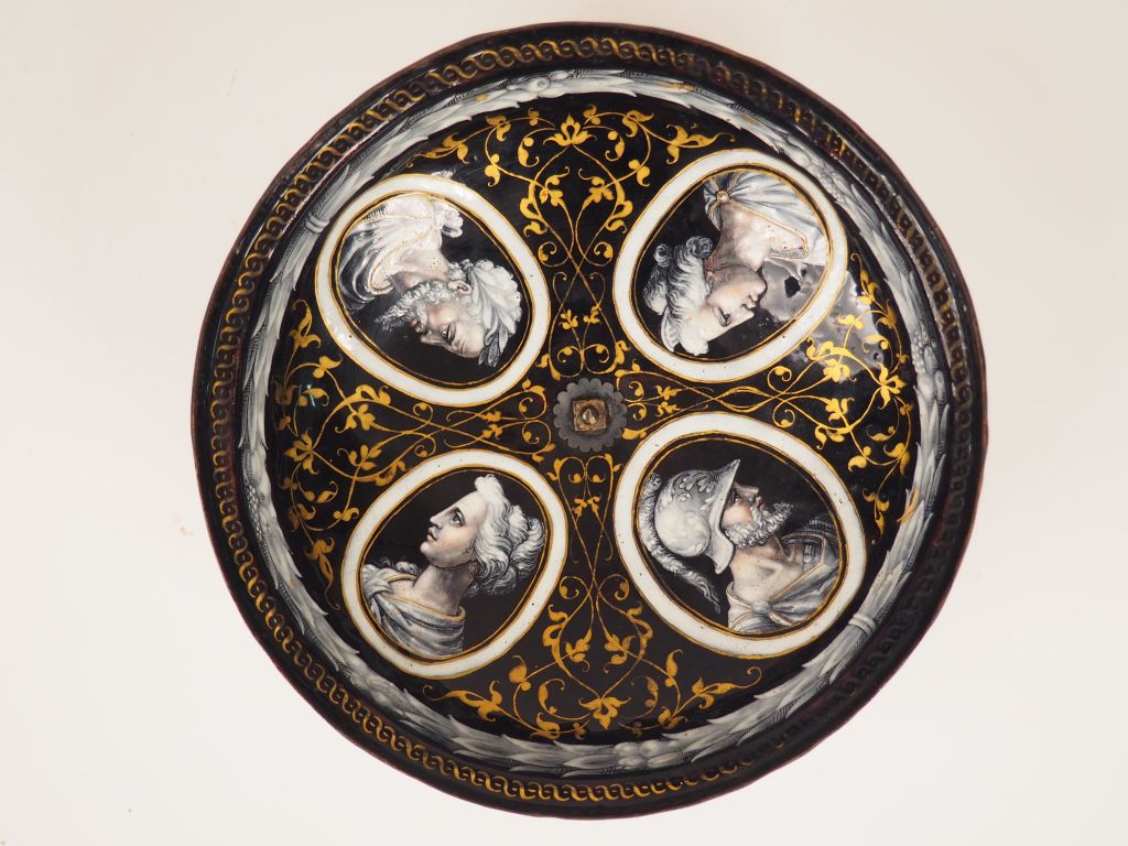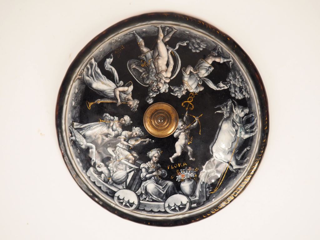 Couvercle de coupe en émail peint en grisaille avec rehauts de rose pour les carnations et d’or représentant le Triomphe de Flore. La divinité agraire est assise dans un char tiré par deux bœufs, un grand vase fleuri Posé devant elle , elle est accompagnée de musiciens et d’animaux ainsi que de Vénus, Mars et Mercure, inscription FLORA dans le champ , intérieur orné de quatre médaillons avec profils à l’antique. Limoges, attribué à Pierre Reymond, milieu du XVIème siècle. Diamètre : 18,5 cm (prise d’époque postérieure, restaurations) On connaît de nombreux couvercles de coupe ornés au revers comme ici de bustes de profil à l’antique. Les ateliers de plusieurs peintres limougeauds en ont ainsi produits. Les thèmes illustrant les dessus de ces couvercles sont variés, tant bibliques que tirés de la Mythologie. Certains exemples illustrent des Triomphes comme celui du Triomphe de Diane sur un couvercle conservé au musée du Louvre signé Pierre Reymond (MR 4960). Expert : Laurence Fligny