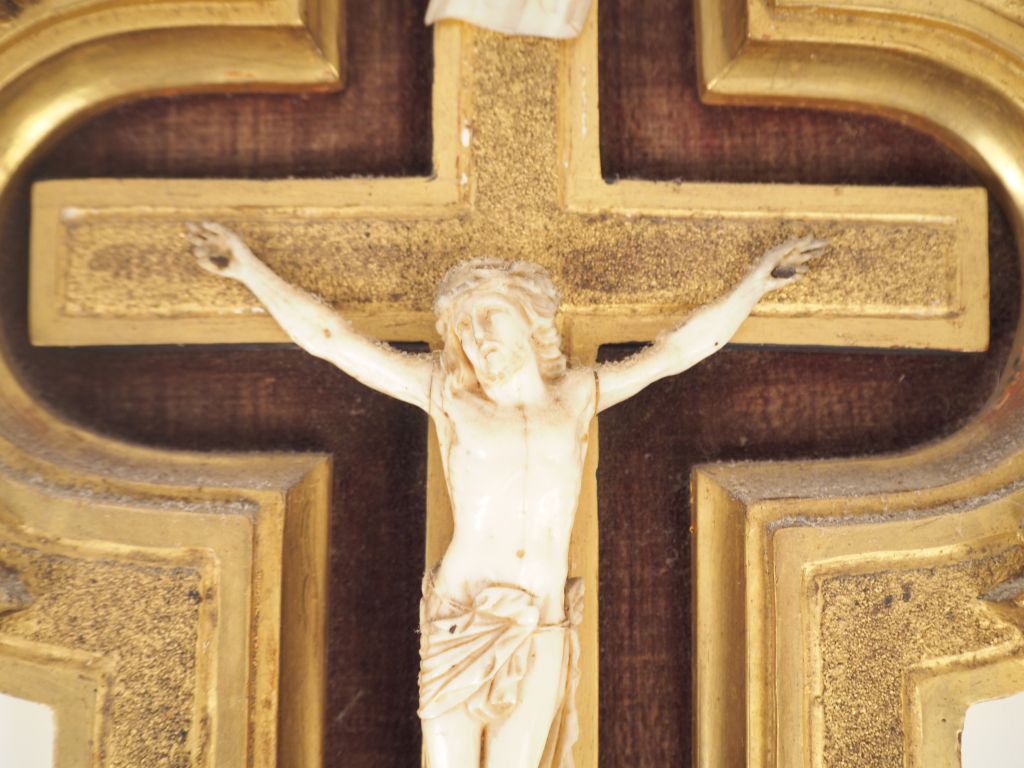 Crucifix XIXème en bois et stuc doré à décor de nœuds de rubans, agrémenté d'un Christ en ivoire sculpté. Dim. 47 x 33 cm. Poids. 900 g. Certificat CITES en cours