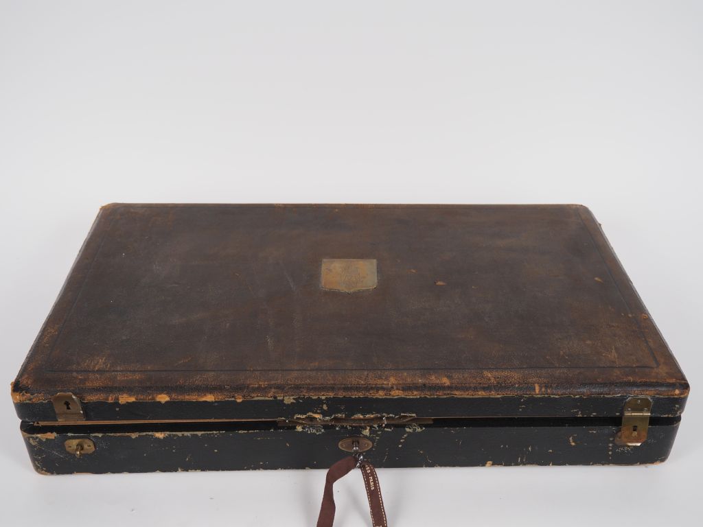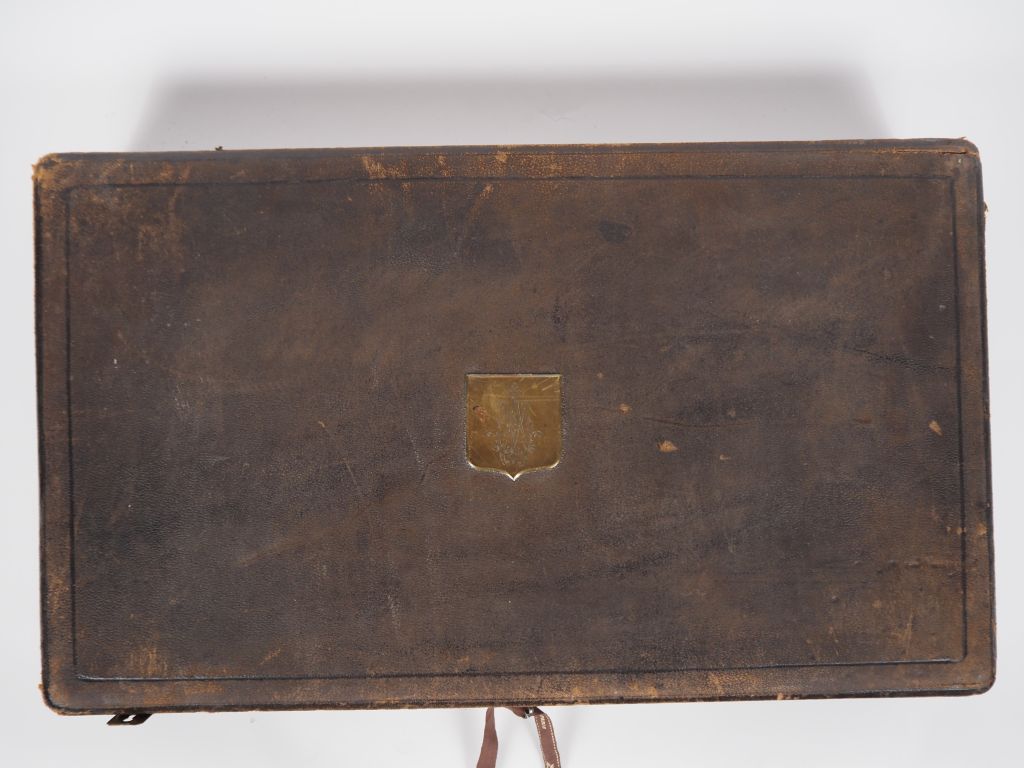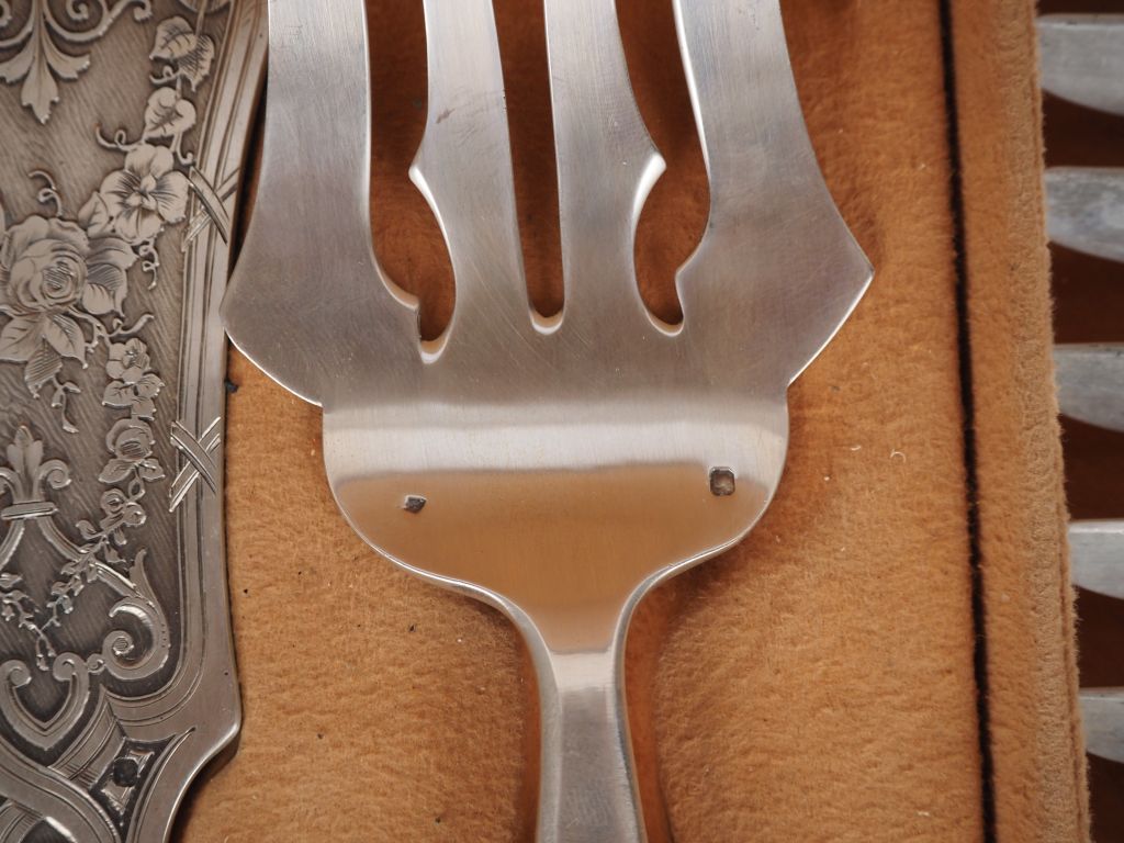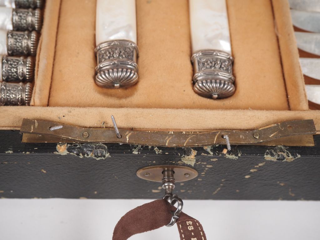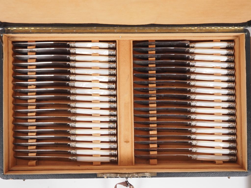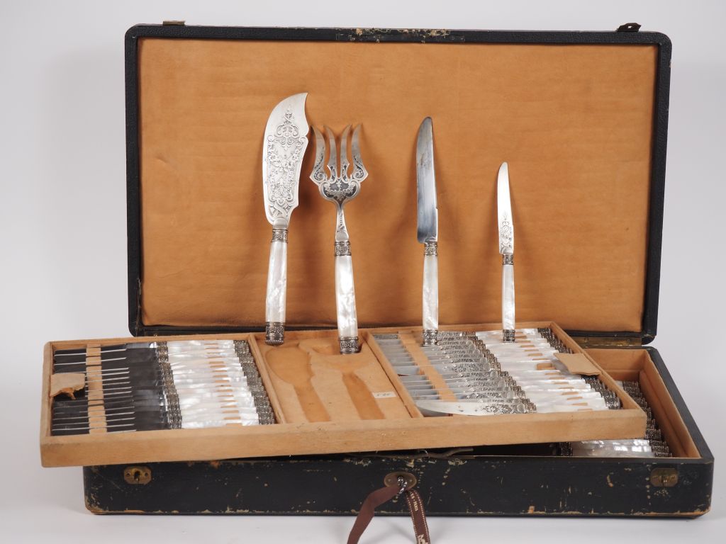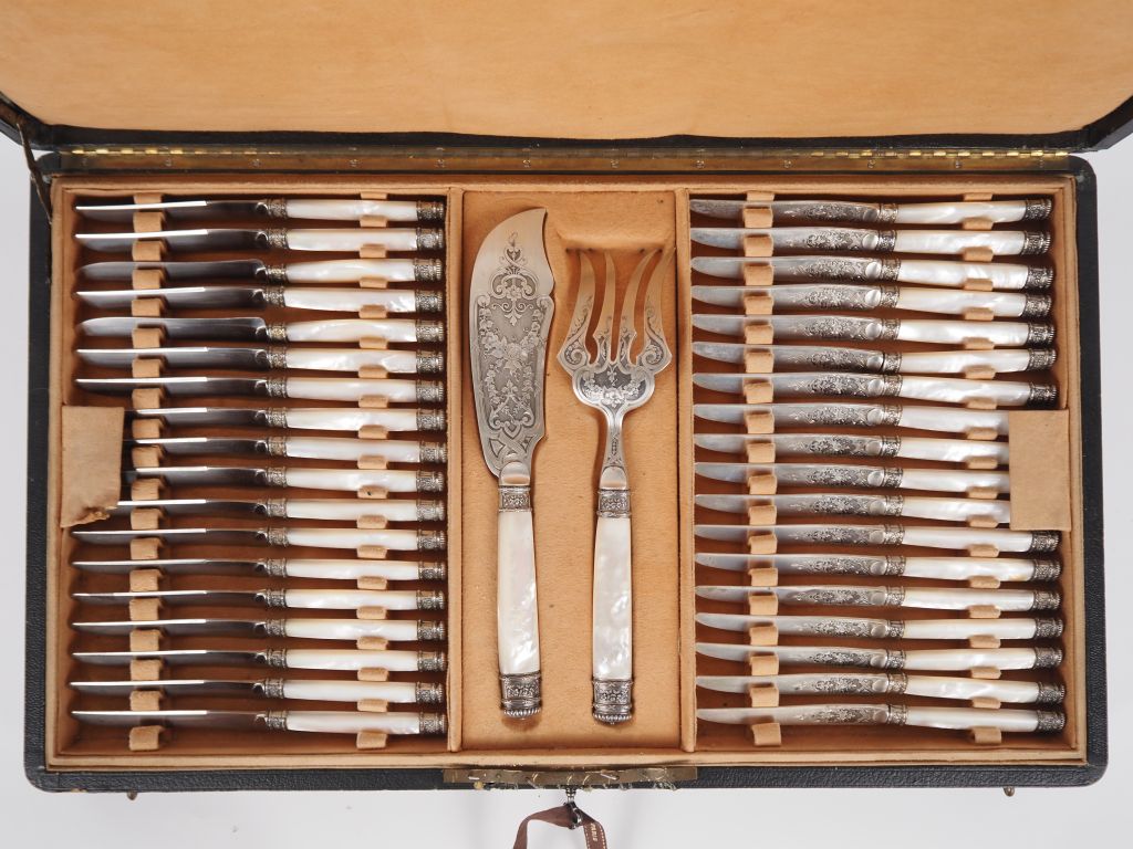 Dans leur écrin d'origine, ensemble de couverts Napoléon III comprenant : un couvert à servir le poisson en argent et nacre, 18 couteaux à fruit lame argent, 18 couteaux à fromage et 36 grands couteaux. (coffret accidenté)
