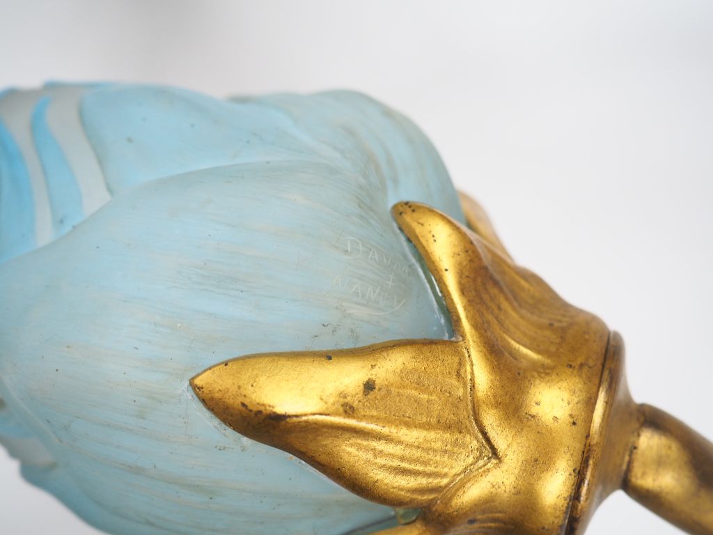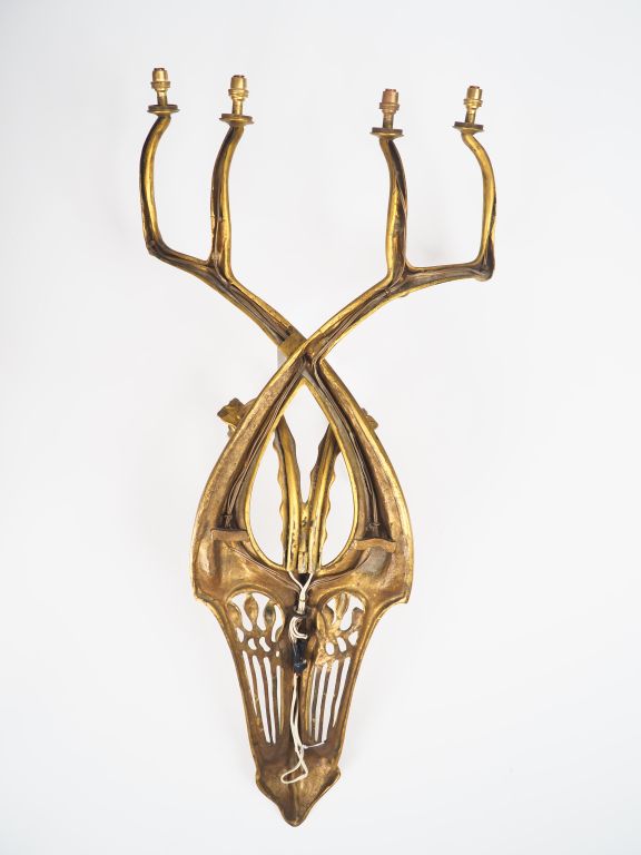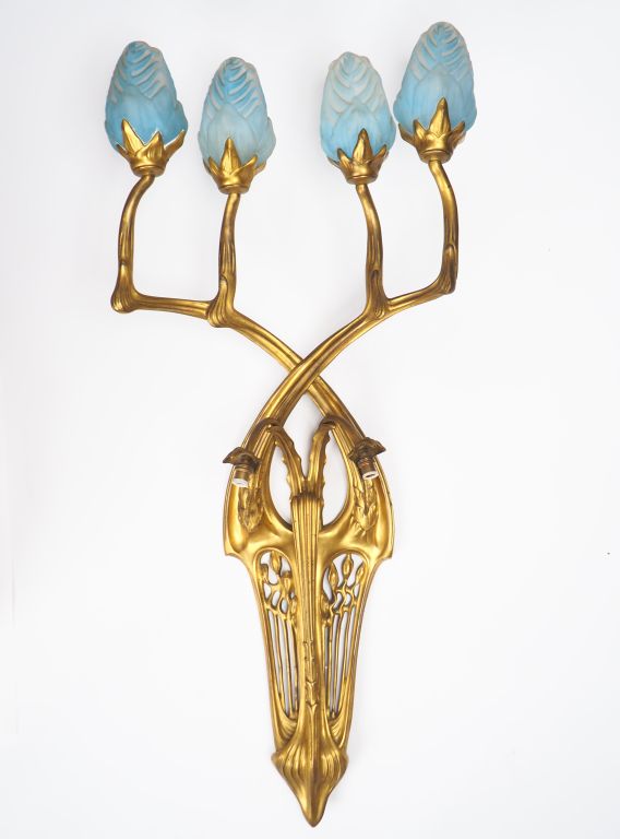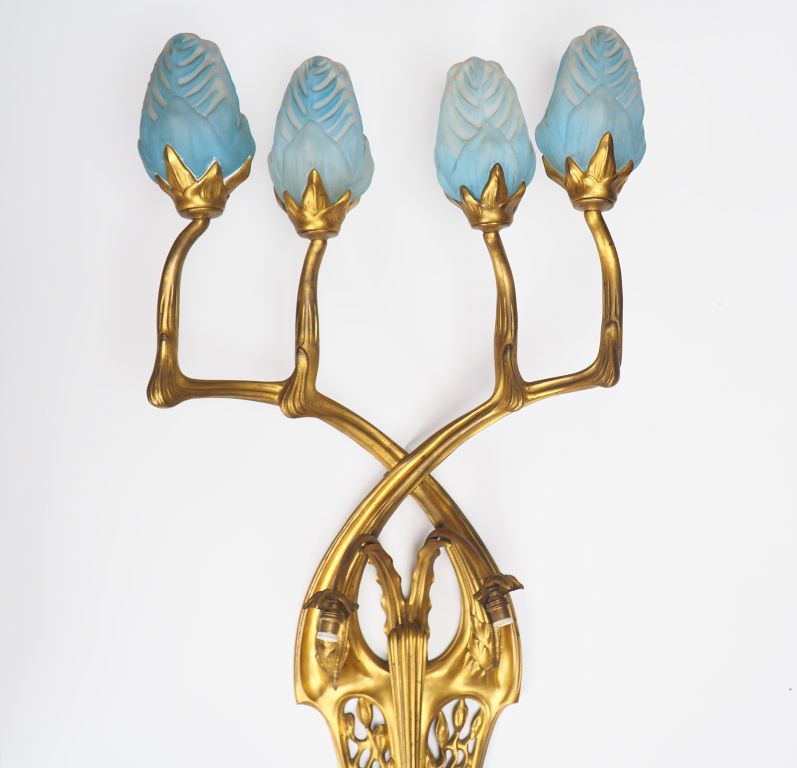 DAUM MAJORELLE. Exceptionnelle applique en bronze doré éclairant à six lumières. Dim. 121 x 54 cm. (Deux tulipes manquantes) La collaboration entre la maison Daum et Majorelle s’est établie dès 1902. De nombreux modèles sont montrés pour la première fois à l’Exposition de l’Alliance provinciale des industries d’Art (« École de Nancy ») tenue en 1903 au Pavillon de Marsan à Paris. Notre applique n’apparaît dans aucun catalogue de la maison Majorelle , il s’agirait donc plutôt d’un modèle hors série, réalisée sur commande(s) particulière(s). On sait qu'elle fut présentée à l’Exposition Internationale de l’Est de la France tenue à Nancy en 1909 puis, l'année suivante, au Salon de la Société des Artistes Décorateurs à Paris. Précisons enfn que si nous ne connaissons pas le nom du modèle, cette applique est toujours associée au mobilier « Orchidées » - particulièrement au Salon de 1909 où le stand Majorelle fut consacré exclusivement à cet ornement. Bibliographie : Bulletin de la Société Industrielle de l’Est, Nancy, janvier 1910. Vue du stand Majorelle à l’Exposition Internationale de l’Est de la France, Nancy, 1909, p. 103. Art et Industrie, septembre 1909. Vue du stand Majorelle à l’Exposition Internationale de l’Est de la France, Nancy, 1909, p. 15. Roselyne Bouvier, Majorelle, La Bibliothèque des Arts, Paris et Éditions Serpenoise, 1991. Vue du stand Majorelle à l’Exposition Internationale de l’Est de la France, Nancy, 1909, p. 199. Alastair Duncan, Louis Majorelle, Meister des Art Nouveau Design, Heyne, München, 1991. [Édition originale : Louis Majorelle, Master of Art Nouveau Design, Thames and Hudson Limited, London, 1991] Vue du stand Majorelle à l’Exposition Internationale de l’Est de la France, Nancy, 1909, p. 171. Vue d'un stand Majorelle, sans lieu ni date, p. 168. Vue du stand Majorelle au Salon des Artistes Décorateurs, 1910, p. 170 et 171. Alastair Duncan, The Paris Salons 1895-1914, Volume III : Furniture, 1996. Vue du stand Majorelle au Salon de la Société des Artistes Décorateurs, Paris, 1910, p. 414. Alastair Duncan, The Paris Salons 1895-1914, Volume V: Objets d’art Metalware, 1999. Wall sconce in gilt-bronze with glass shades by Daum frères / La Société des Artistes Décorateurs, 1910, p. 397.