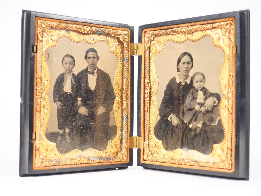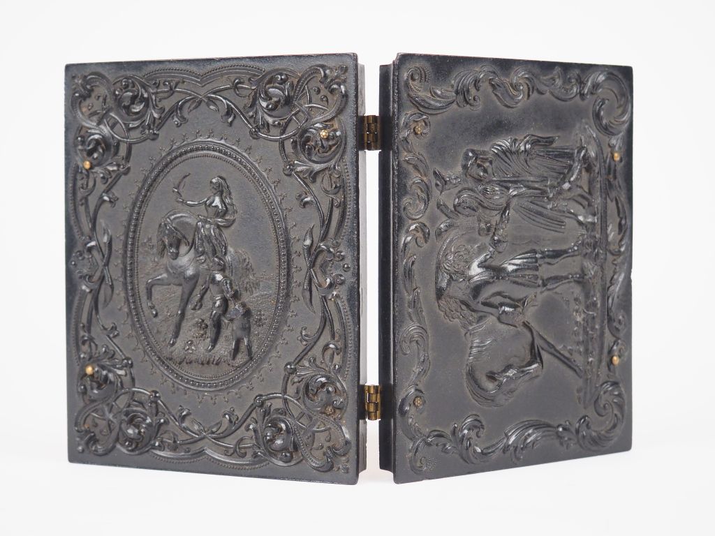 Deux daguerréotypes "portraits de famille" dans leur encadrement à deux volets en bakélite, à décor de scènes chevaleresques.