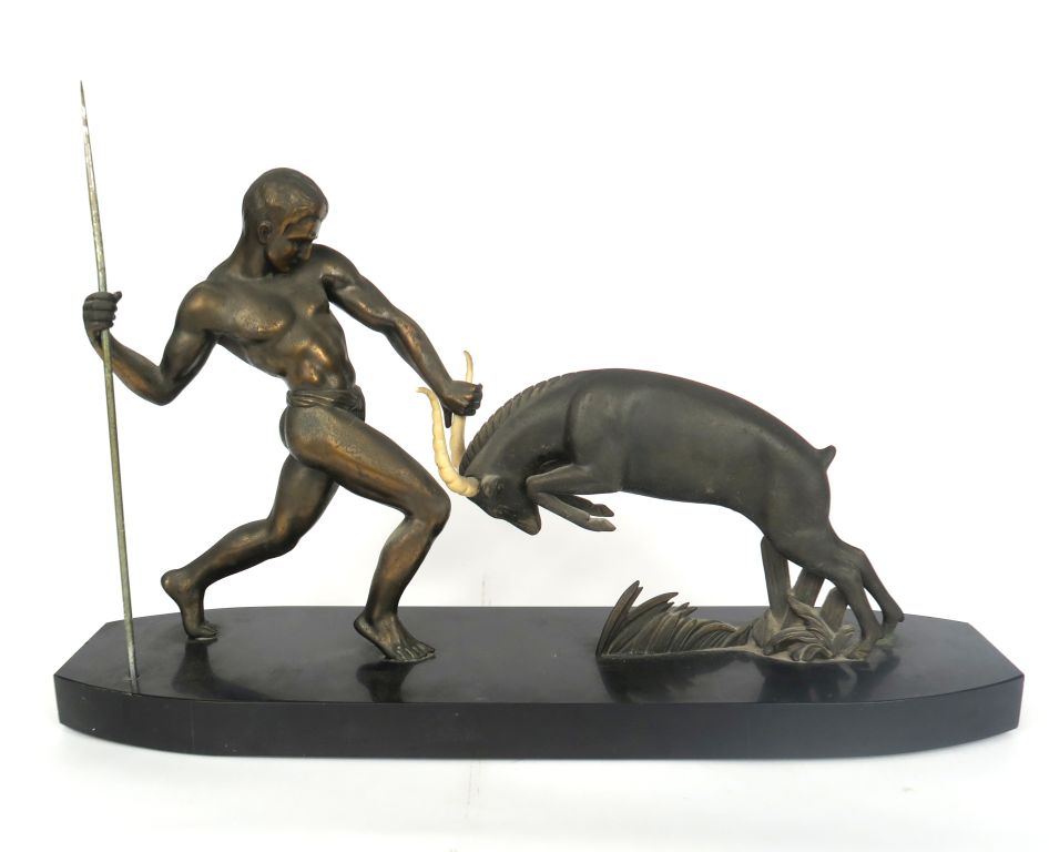 Ecole française vers 1930. "Chasseur et gazelle" Groupe en régule et marbre polychrome Dim. 37 x 62 x 16,5 cm