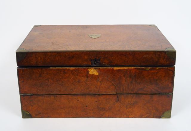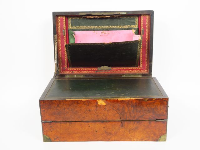 Ecritoire de voyage début XIXème en placage de loupe d'orme et laiton (accidents)