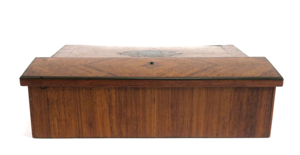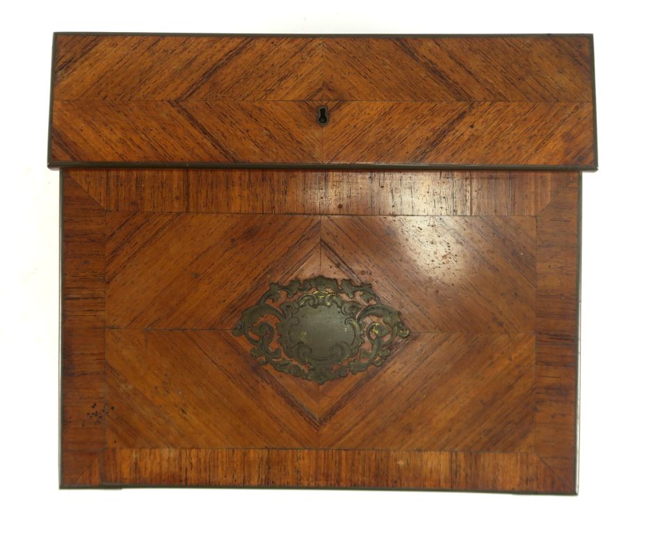 Ecritoire XIXème en marqueterie, fileté de laiton. 8 x 29 x 24 cm (petit accident à l'un des encriers)