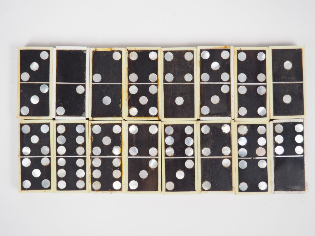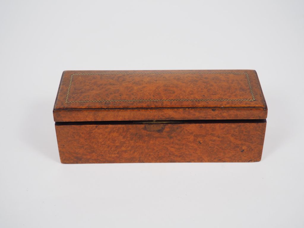 Elégant coffret à jeux de dominos en placage de loupe d'amboine et filet de laiton avec ses dominos