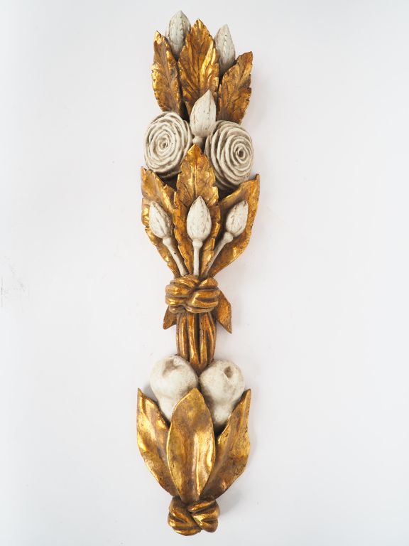 Elément décoratif en bois sculpté, peint et doré figurant un bouquet de fleurs et de feuillage. Dim. 82 x 20 cm