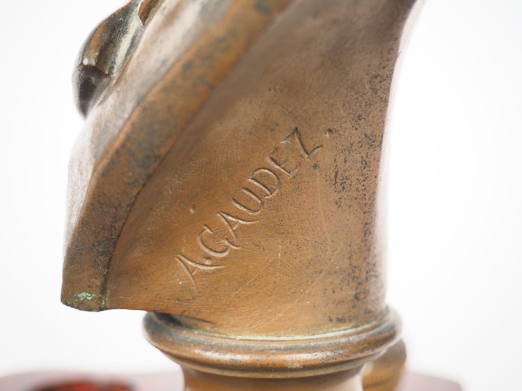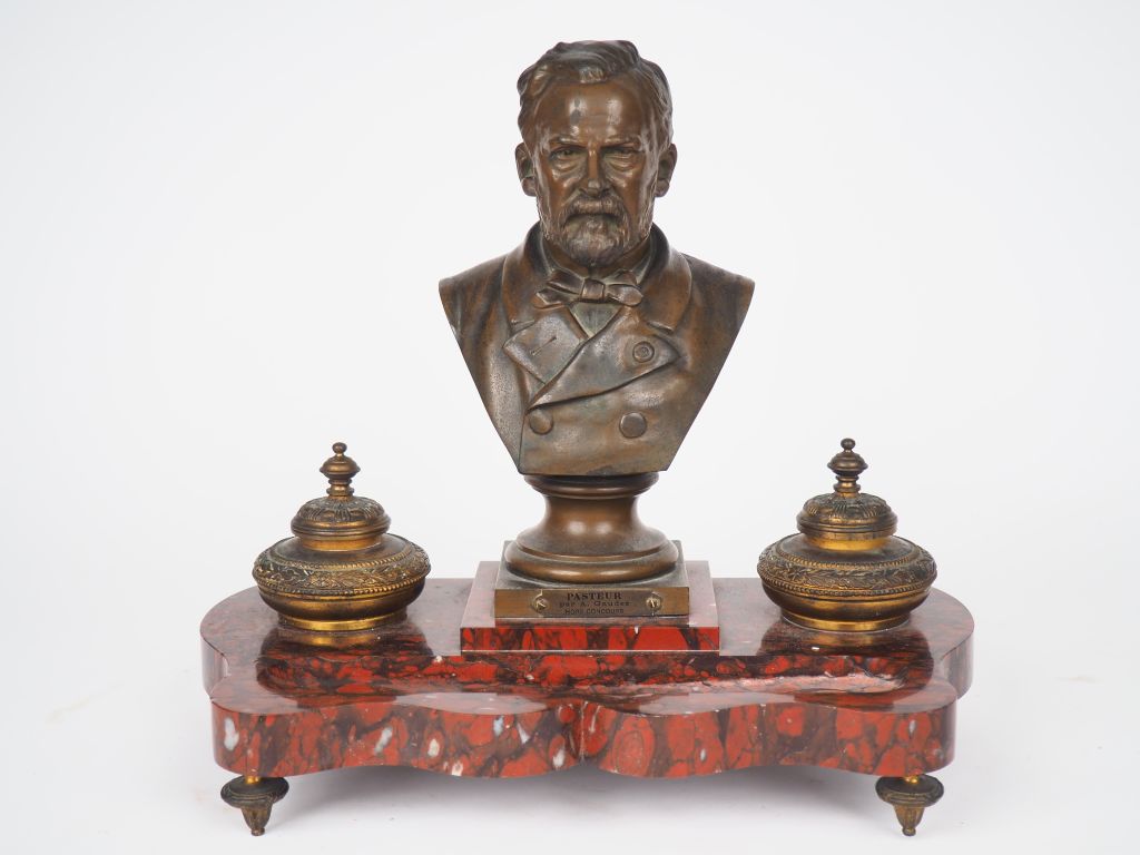 Encrier en marbre rouge et bronze à patine brune, portrait de Pasteur en buste par A. Gaudez H. du bronze : 32 x 35 x 19,5 cm