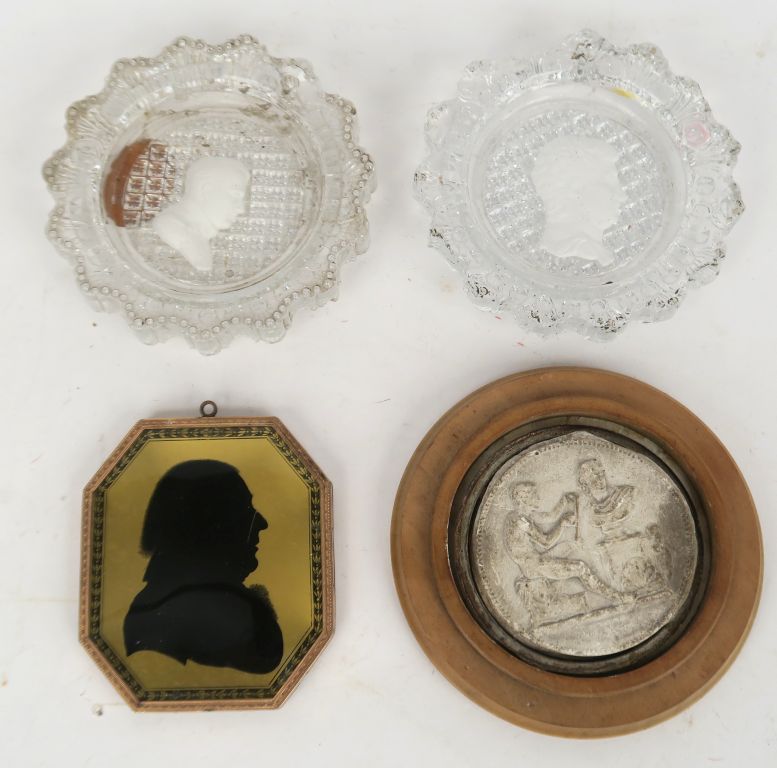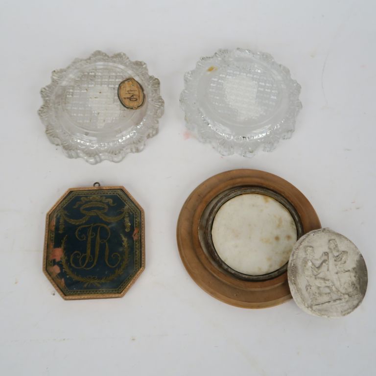 Ensemble comprenant : -Un médaillon octogonal en pomponne représentant un profil d’homme en verre églomisé. Revers (manques) au chiffre « JR » sous couronne. 8 x 6 cm. Vers 1800 -Deux vides poches en cristal avec profil en céramique de Lafayette à l’antique et Napoléon Ier. Diam : 8,5 cm. -Tirage de médaille en plâtre.