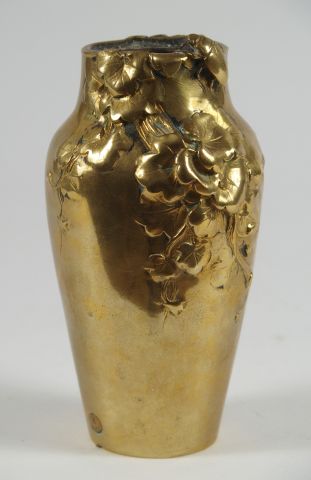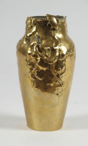F. DEBON. Vase Art Nouveau en bronze, à décor en relief de fleurs et de scarabé. Signé. H. : 18 cm