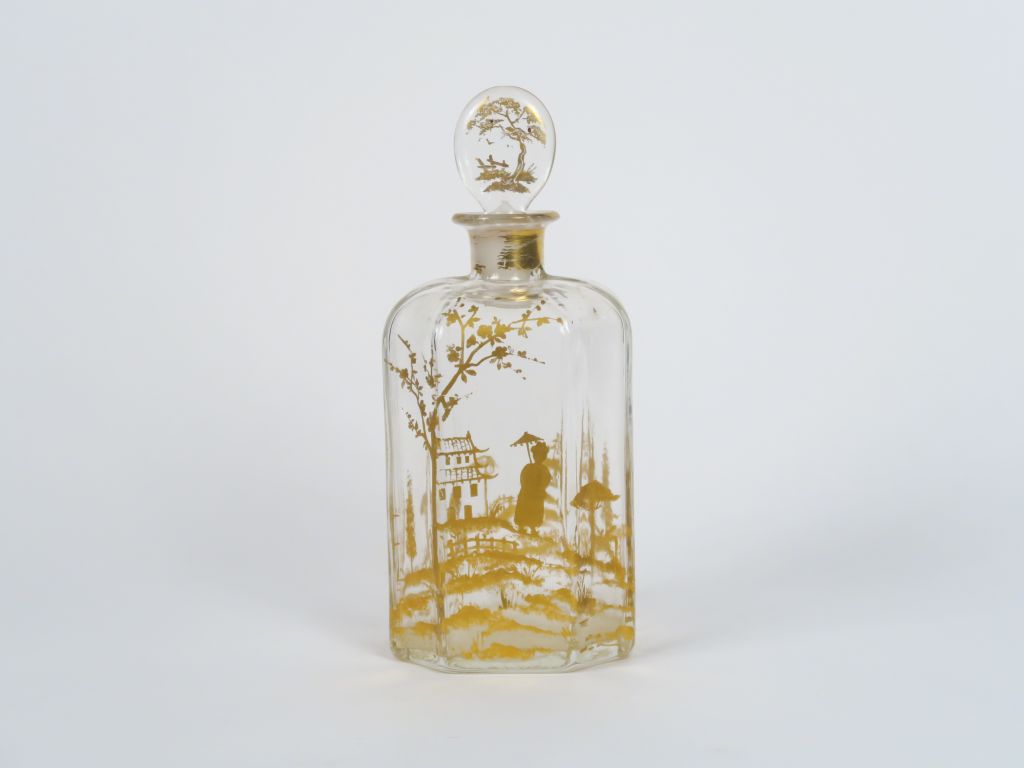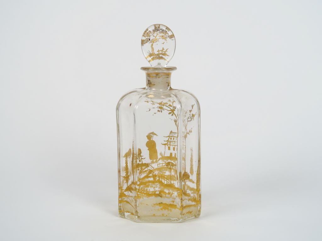 Flacon Napoléon III en cristal à décor doré d'une scène extrême-orientale. H. 22 cm