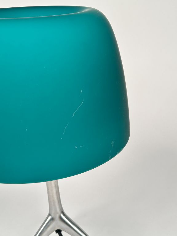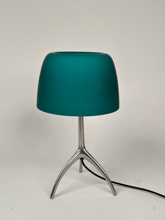 FOSCARINI. VETRO a Murano. Lampe de salon moderne. Abat jour en verre vert, piètement tripode en métal chromé. H. 46 cm