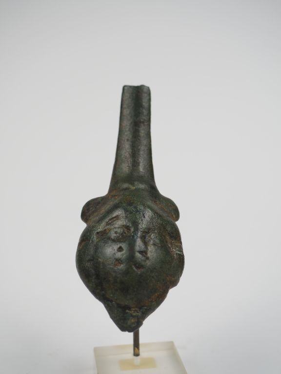 Fragment d’une anse en bronze décorée d’une tête. H. : 9 cm.