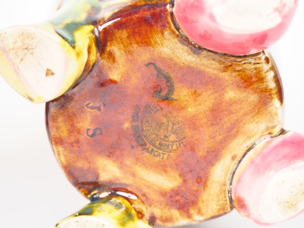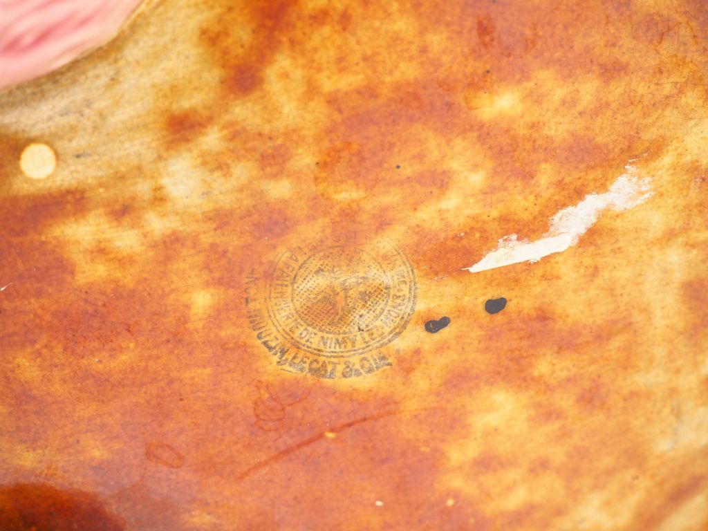Garniture Art Nouveau en barbotine à décor de fleurs polychromes et de branchages. H. des vases : 34 cm Dim. Jardinière : 18 x 37,5 cm