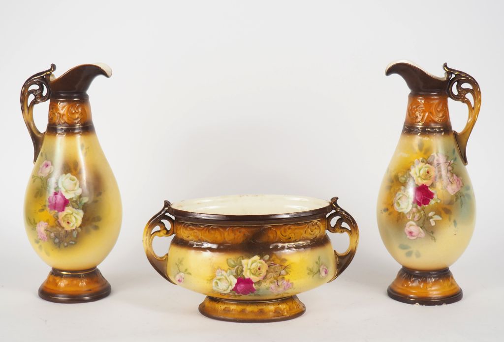 Garniture de cheminée 1900 en faience fine à décor polychrome de bouquet de roses, sur fond jaune comprenant : une paire d'aiguières et une jardinière. H. aiguières : 36 cm