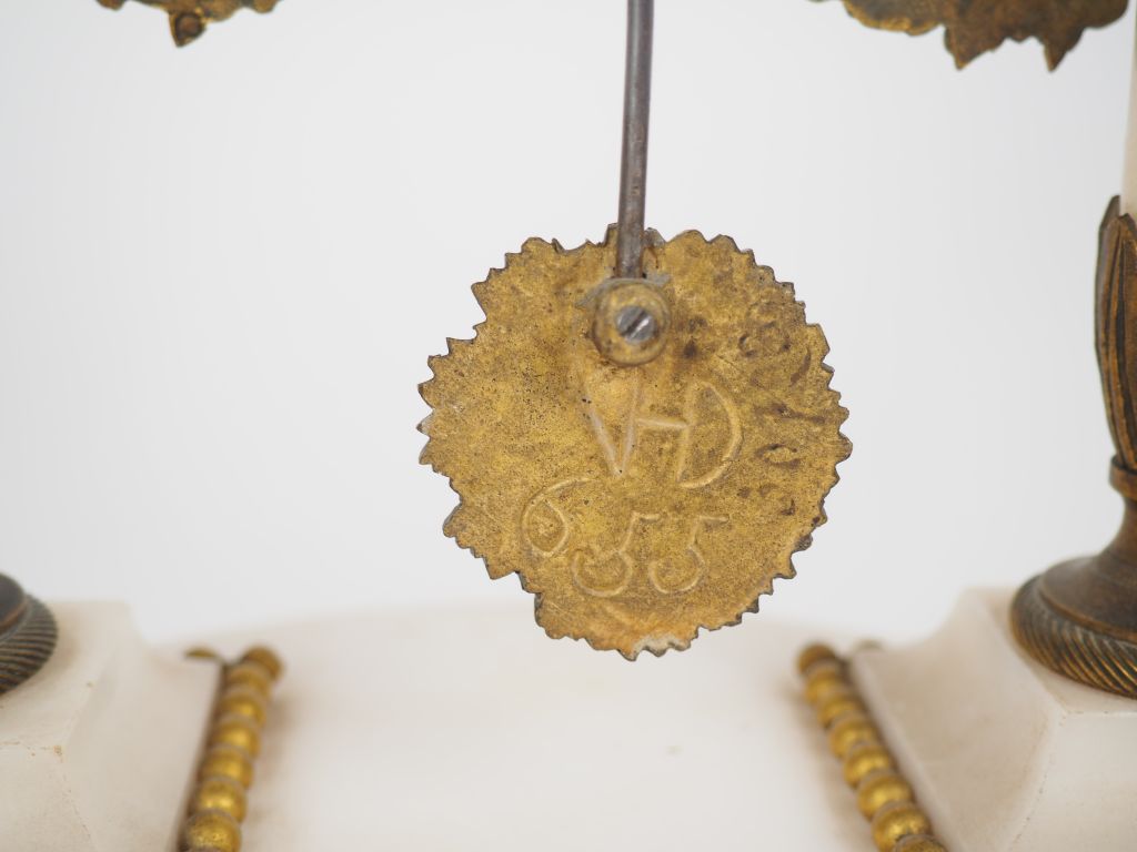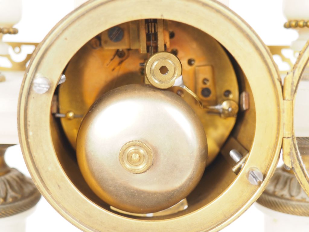 Garniture de cheminée fin XIXème - début Xxème en albâtre et bronze à décor de pot-à-feu, de frises de perles et de palmettes. Comprenant une pendule portique et une paire de bougeoirs doubles. Dim. (pendule) : 39 x 19,5 x 9,5 cm. Dim. 26,5 x 17 cm.