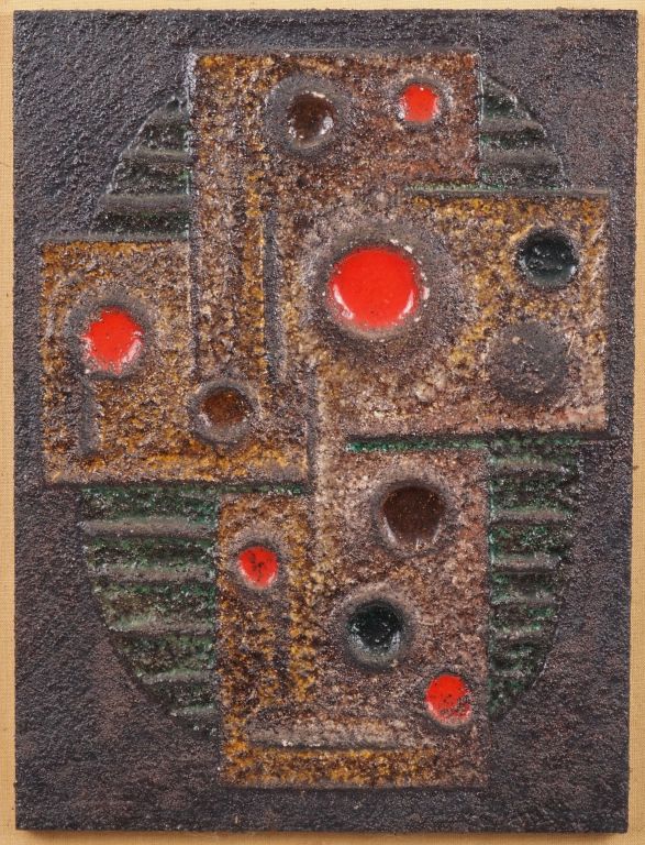 Gilbert PORTANIER. Plaque en terre émaillée polychrome à décor de motifs abstraits. Signée Dim. 30 x 40 cm