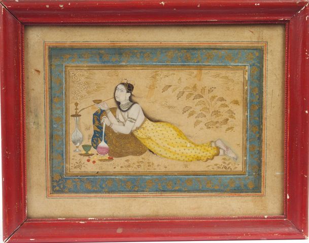 Gouache persane XIXème "La fumeuse de narguilé". Signée en bas à gauche. Dim. : 14 x 20,5 cm