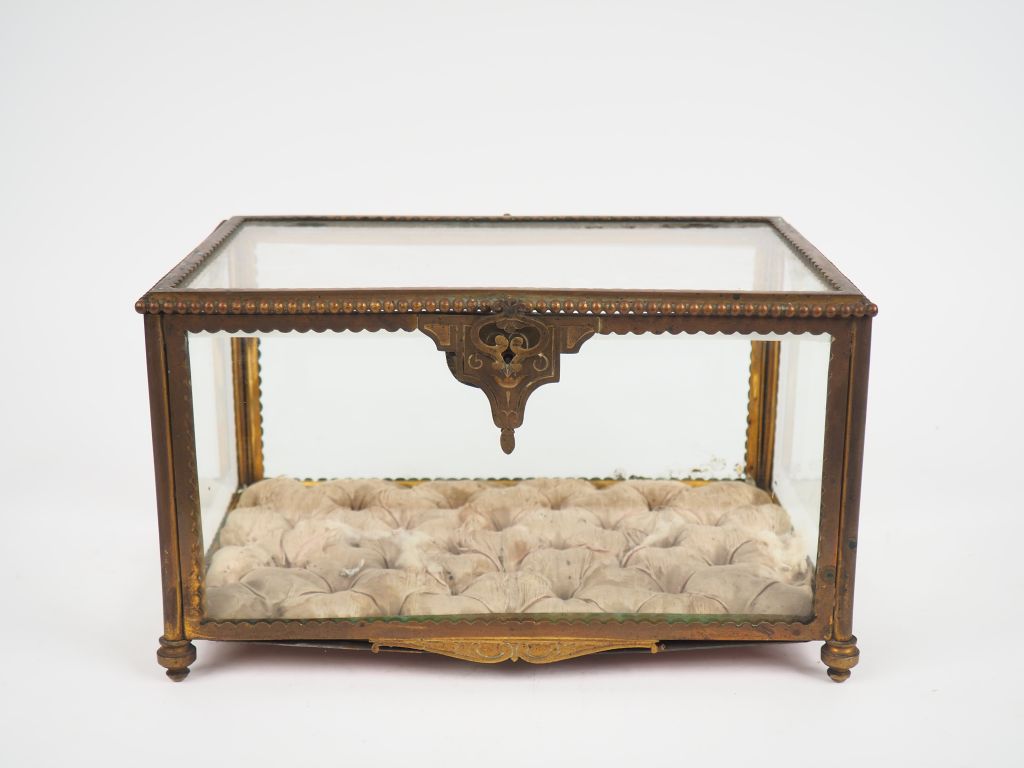 Grand coffret à bijoux XIXème en verre, laiton, à décor d'une frise de perles, intérieur en soie capitonnée. Dim. 18,5 x 13,5 x 20,5 cm. (Une charnière manquante, soie usée).
