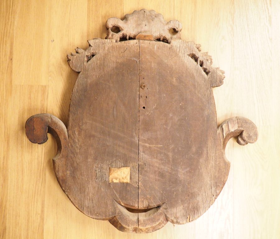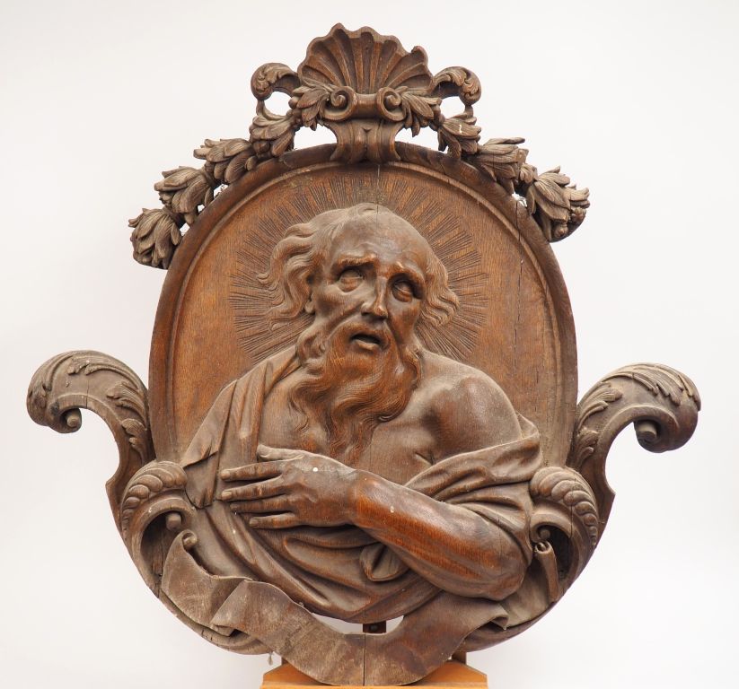 Grand médaillon en chêne sculpté en haut relief représentant un saint en buste, la tête nimbée de rayons , encadrement surmonté d’une coquille entourée avec guirlandes de fleurs, crosses feuillagées et banderole. XVIIIème siècle. Hauteur : 94 cm – Largeur : 93 cm (quelques accidents et manques) Expert : Laurence Fligny