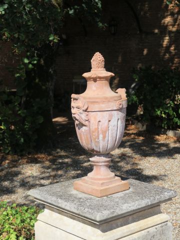 Lot de Grand vase couvert en terre cuite, anses en forme de masques. H. au prix de 300 à 500 € en vente aux enchères par l'hôtel des ventes Primardeco