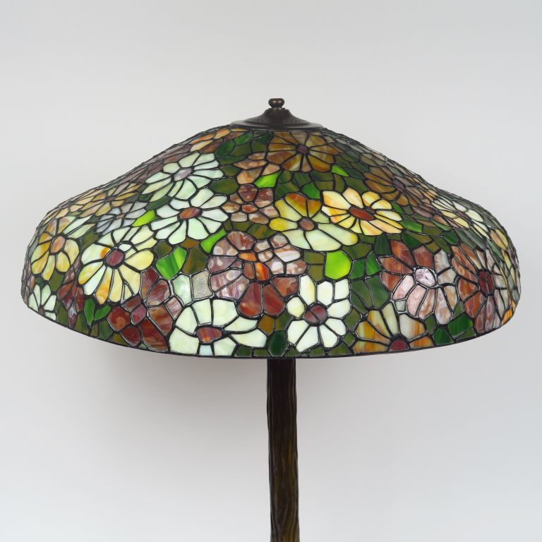 Grande lampe de style 1900 en bronze et verre multicolore. H. 78 cm