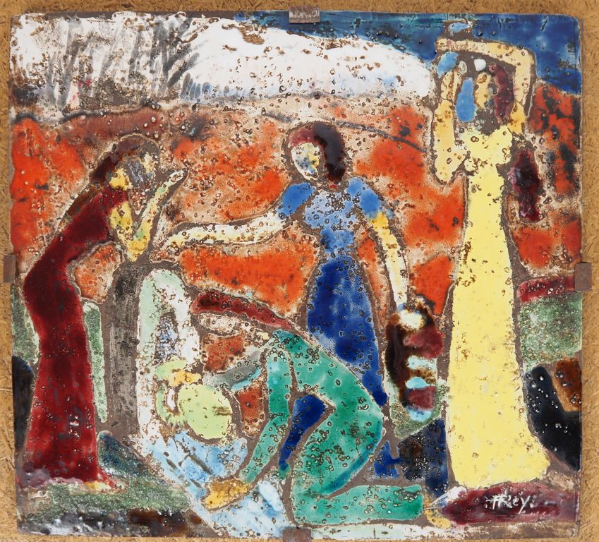 Henri Paul REY. "Femmes à la fontaine" Plaque en terre cuite émaillée polychrome Signée Dim 23 x 25 cm