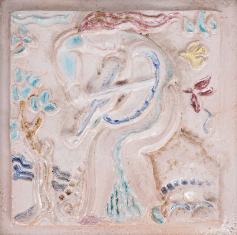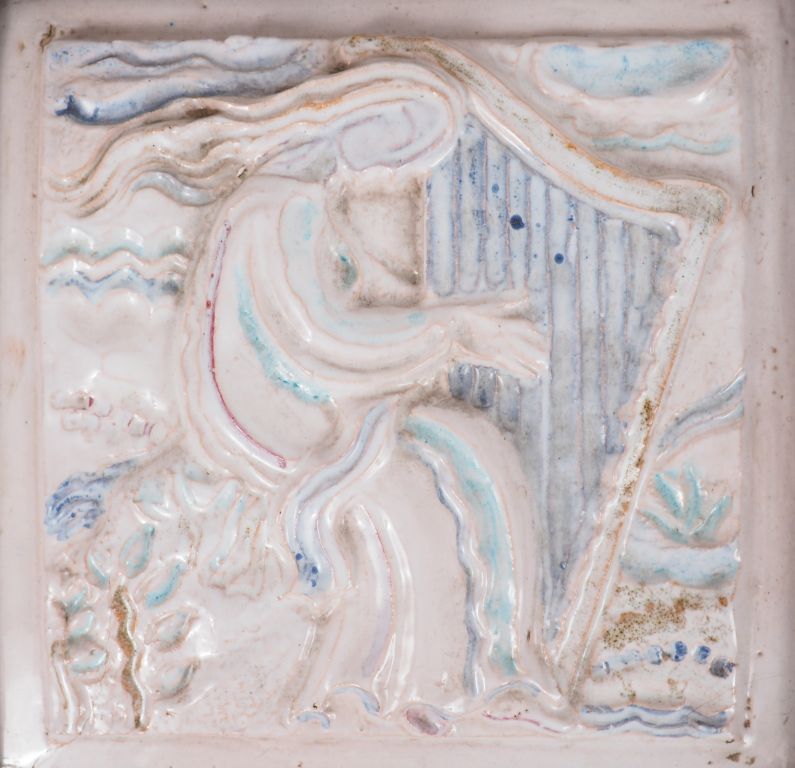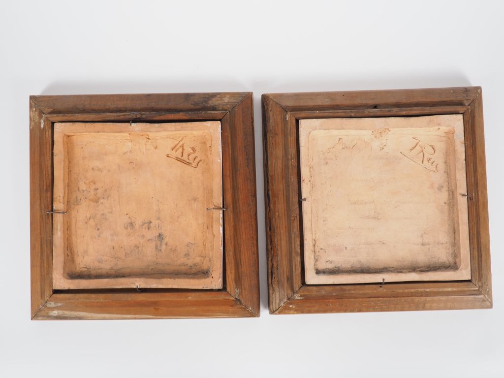 Henri Paul REY. Paire de plaques en terre cuite émaillée "violoniste" et "harpiste" Signées Dim. 22,5 x 22,5 cm