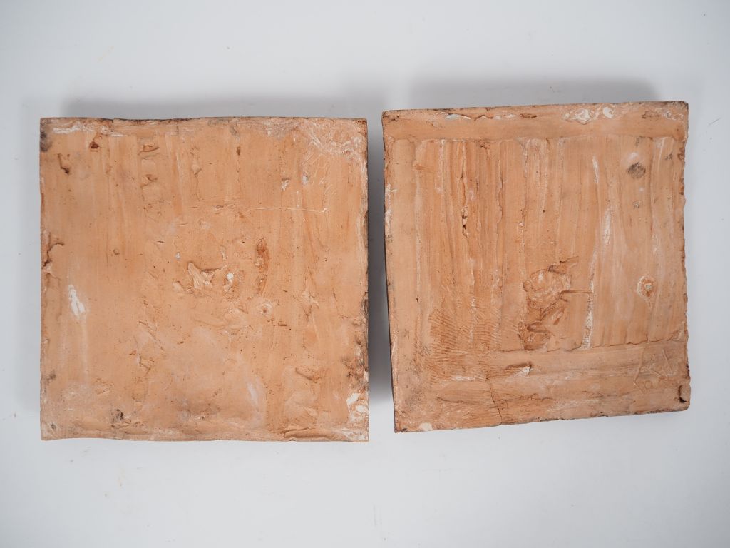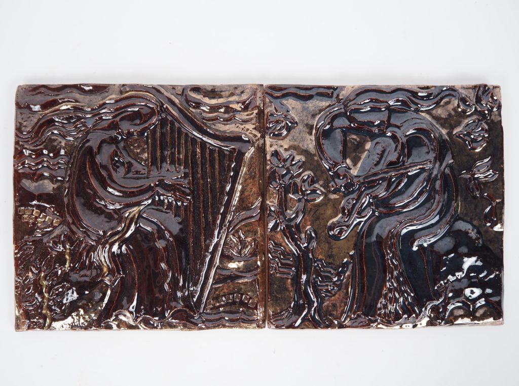 Henri Paul REY. "Violoniste et harpiste" Paire de plaques en terre cuite émaillée brune et cuivré Signées Dim. 18,5 x 18 cm